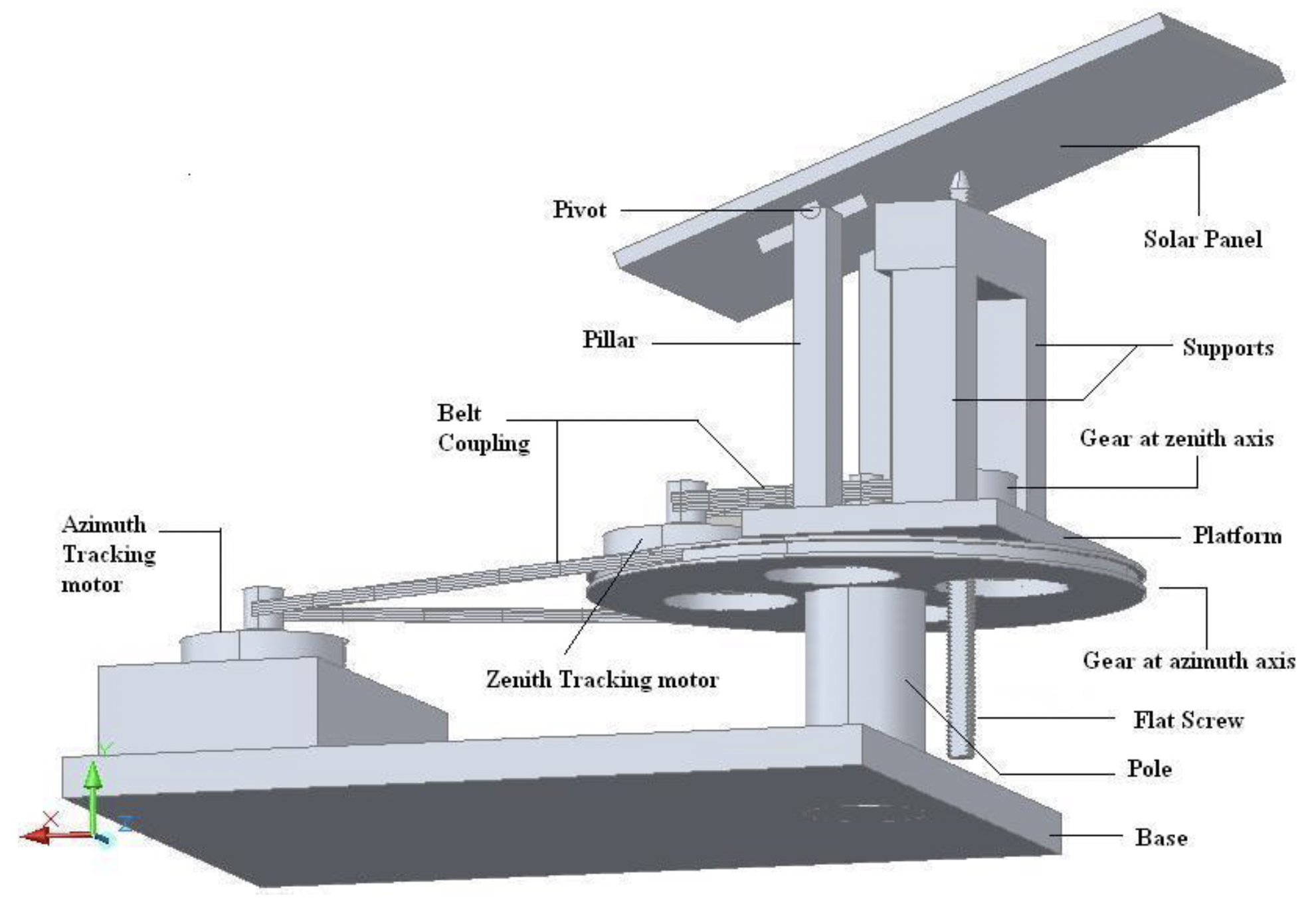 This project involves the conceptual mechanical design of a dual-axis solar tracking system intended to support and orient a photovoltaic panel array with a total weight of approximately 120 kg. The tracking mechanism is designed to rotate and tilt the panel to maximize solar exposure throughout the day.